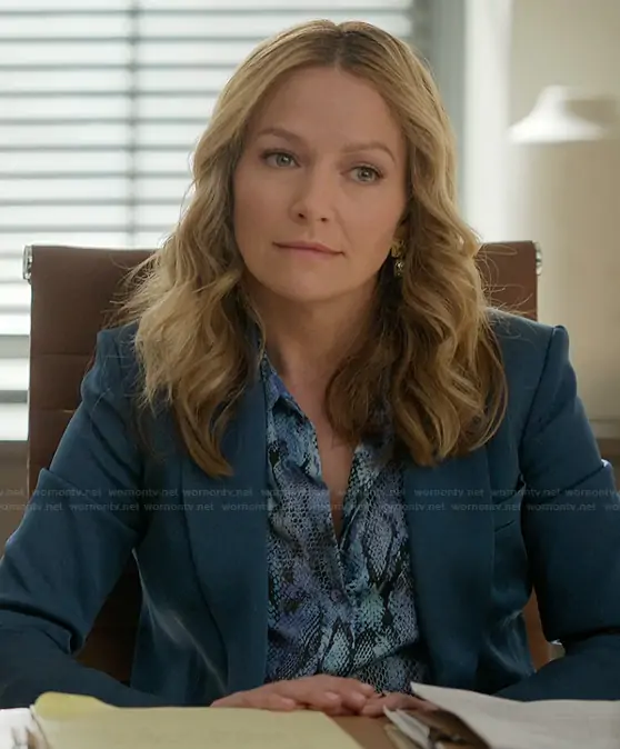 Lorna Crane (played by Becki Newton) on The Lincoln Lawyer on Netflix was spotted wearing this blue snake skin print blouse on The Lincoln Lawyer on episode 'Baja' (4x02) in Feb 2026. Lorna's Top is the Tyler Snake Silk Blouse by L'Agence.