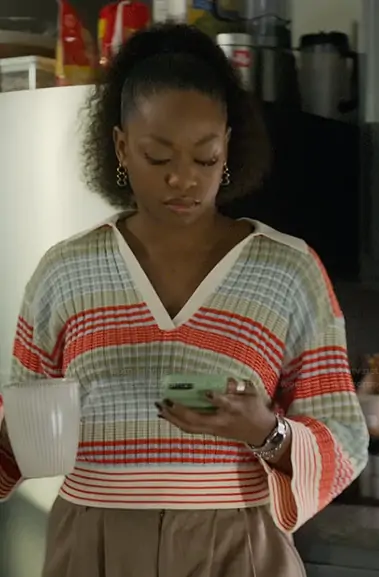 Izzy Letts (played by Jazz Raycole) on The Lincoln Lawyer on Netflix was spotted wearing this stripe knit v-neck top on The Lincoln Lawyer on episode 'Forty Hours' (4x03) in Feb 2026. Izzy's Top is the Azaria Striped Top by Ramy Brook.