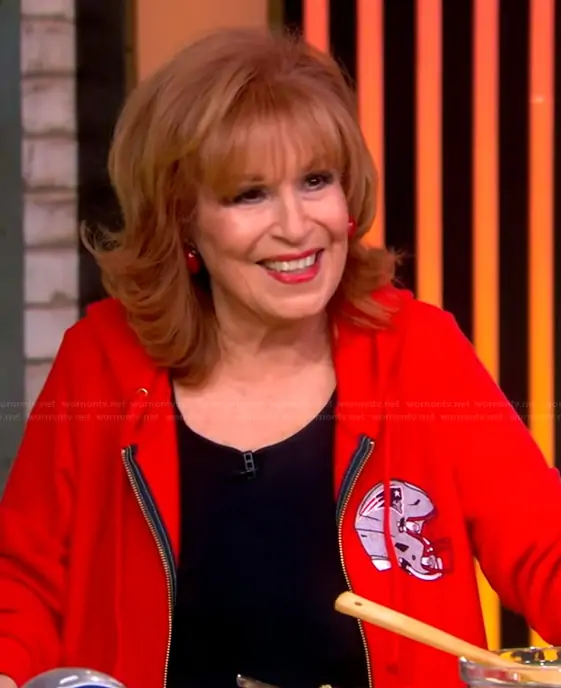 Joy Behar on The View on ABC was spotted wearing this red hoodie on The View on Feb 07 2026's episode. Joy's Sweater is the New England Patriots Zip Hoodie by Aviator Nation.