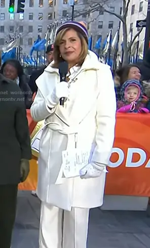 Hoda Kotb on Today on NBC was spotted wearing this white hooded wool coat on Today on Feb 24 2026's episode. Hoda's Coat is the Shia-SLB 2-in-1 Double Face Wool Coat with Removable Bib in Cream by Mackage.