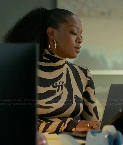 Izzy Letts (played by Jazz Raycole) on The Lincoln Lawyer on Netflix was spotted wearing this zebra stripe mesh top on The Lincoln Lawyer on episode 'Bleeding the Beast' (4x04) in Feb 2026. Izzy's Top is the Zebra Print Logo Turtleneck Top by Off White.