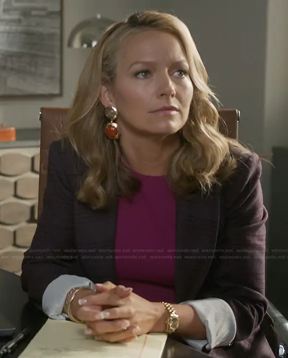 Lorna Crane (played by Becki Newton) on The Lincoln Lawyer on Netflix was spotted wearing this purple plaid blazer on The Lincoln Lawyer on episode 'You're the One That I Want' (4x05) in Feb 2026. Lorna's Blazer is the Oria Dickey Jacket in Aubergine by Veronica Beard . Lorna's Sunglasses is the Cat-Eye Gradient Sunglasses by Miu Miu . Lorna's Earrings is the Geo Bezel Drop Earrings by Lele Sadoughi.
