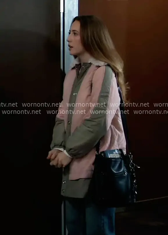 Josslyn Jacks (played by Eden McCoy) on General Hospital on ABC was spotted wearing this pink and green jacket on General Hospital on Feb 09 2026's episode. Josslyn's Jacket is the Sherpa Fleece Collar Quilted Liner Coat by Pilcro at Anthropologie .
