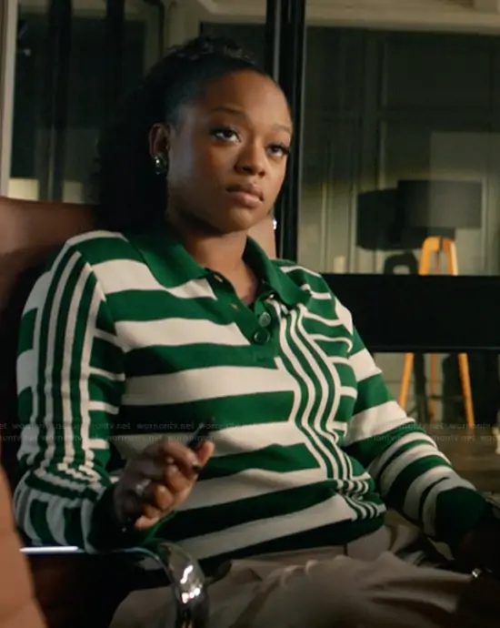 Izzy Letts (played by Jazz Raycole) on The Lincoln Lawyer on Netflix was spotted wearing this green stripe polo sweater on The Lincoln Lawyer on episode 'You're the One That I Want' (4x05) in Feb 2026. Izzy's Sweater is the Striped Knit Polo Sweater by Zara.