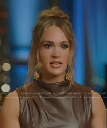 Carrie Underwood on American Idol on ABC was spotted wearing this brown gathered leather top on American Idol on Feb 10 2026's episode. Carrie's Top is the Locked and Loaded Faux Leather Blouse in oxblood by Akira . Carrie's Earrings is the Aretes Opus Earrings by Elisheva & Constance.