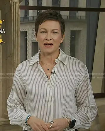 Stephanie Gosk on Today on NBC was spotted wearing this white pinstripe shirt on Today on Feb 10 2026's episode. Stephanie's Top is the The Charles Button-Up Shirt in Cream/ Navy by Frame.