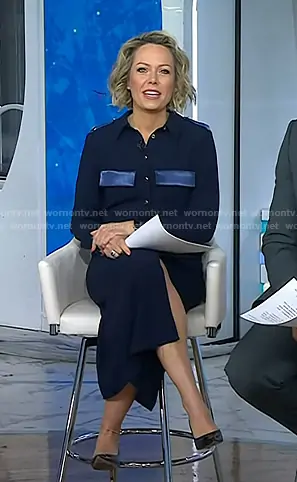 Dylan Dreyer on Today on NBC was spotted wearing this navy shirtdress on Today on Feb 10 2026's episode. Dylan's Dress is the Gara Midi Shirt Dress by Area Stars.