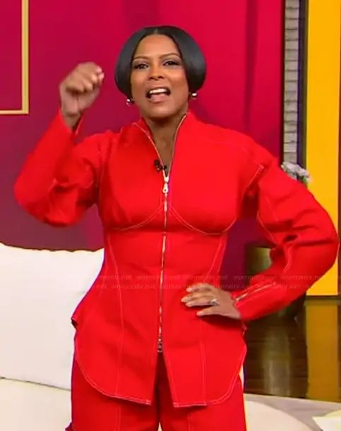 Tamron Hall on Tamron Hall Show on ABC was spotted wearing this red corset panel jacket on Tamron Hall Show on Feb 10 2026's episode. Tamron's Jacket is the Paneled denim jacket by Tolu Coker . Tamron's Pants is the Banana cutout high-rise barrel-leg jeans by Tolu Coker.
