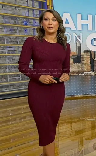 Ginger Zee on Good Morning America on ABC was spotted wearing this burgundy ribbed knit dress on Good Morning America on Feb 10 2026's episode. Ginger's Dress is the Geo Knit Midi Dress by Adam Lippes.