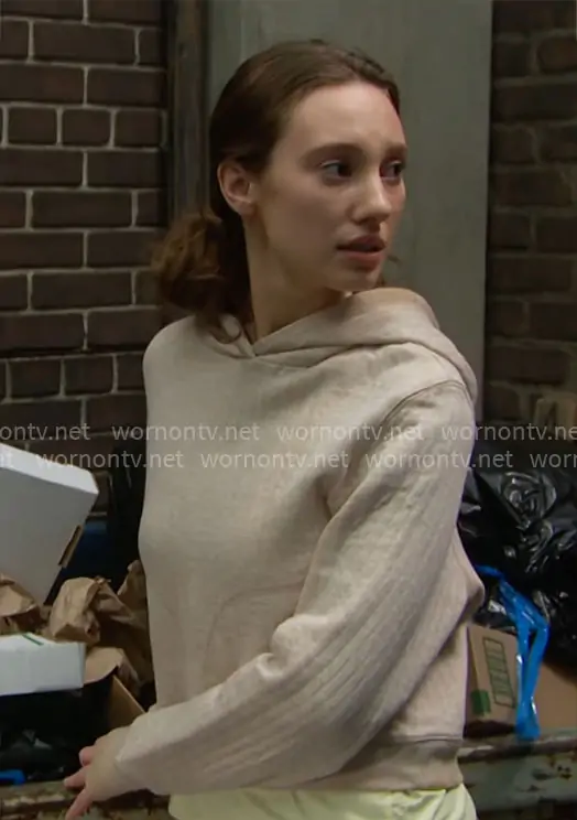 Melissa Dylan (played by Sydney Bullock) on The Bold and the Beautiful on CBS was spotted wearing this beige hoodie on The Bold and the Beautiful on Feb 10 2026's episode. Dylan's Sweater is the Quilted Pullover Lounge Hoodie by And Now This.