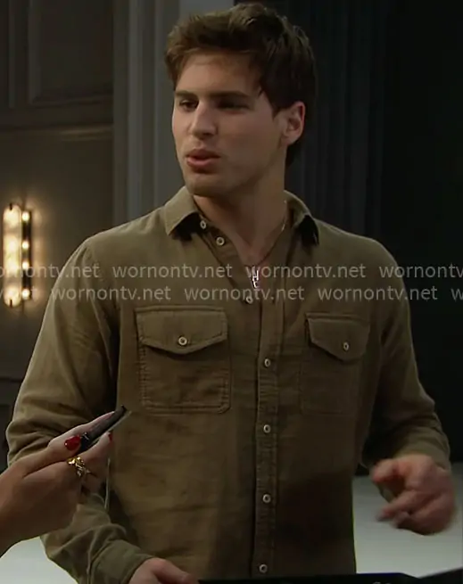 Will Spencer (played by Crew Morrow) on The Bold and the Beautiful on CBS was spotted wearing this olive green cotton gauze shirt on The Bold and the Beautiful on Feb 10 2026's episode. Will's Shirt is the Leeds Shirt by Rowan.