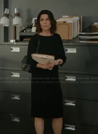 Maggie McPherson (played by Neve Campbell) on The Lincoln Lawyer on Netflix was spotted wearing this black sheath dress on The Lincoln Lawyer on episode 'Honor Among Thieves' (4x07) in Feb 2026.