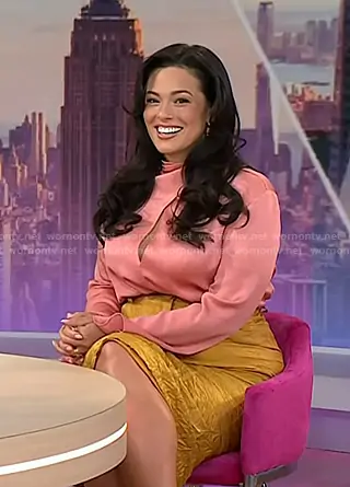 on Today on NBC was spotted wearing this pink keyhole blouse and yellow textured skirt on Today on Feb 11 2026's episode. 's Top is the Gaby Keyhole-neck Blouse by Silvia Tcherassi . 's Skirt is the Layan Midi Skirt by Silvia Tcherassi.