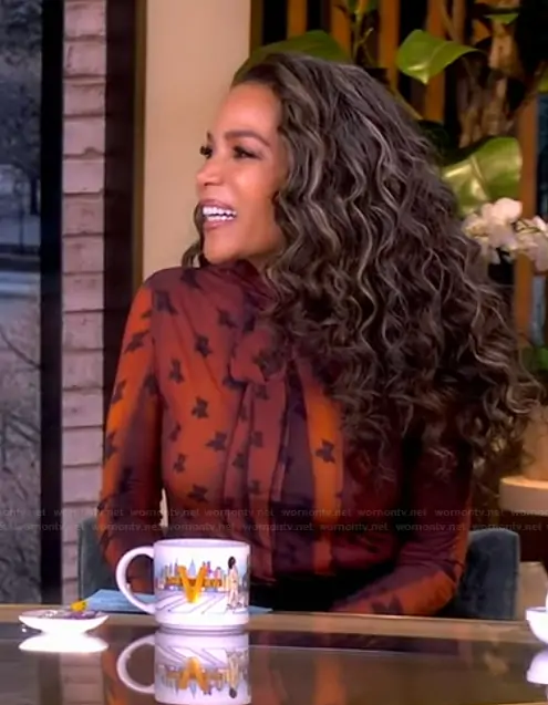 Sunny Hostin on The View on ABC was spotted wearing this printed mesh turtleneck top on The View on Feb 11 2026's episode. Sunny's Top is the Trompe-l'œil high-neck top by Acne Studios.