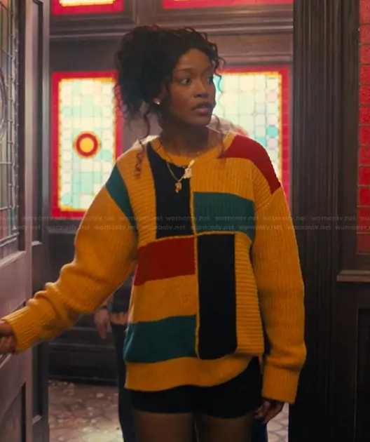 Samira Fisher (played by Keke Palmer) on The Burbs on Peacock was spotted wearing this colorblock patterned sweater on The Burbs on episode 'Mind Your Own Business' (1x02) in Feb 2026. Samira's Sweater is the Lambswool Colorblock Pattern Pullover by Denim Tears.