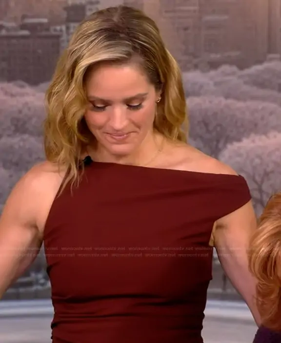 Sara Haines on The View on ABC was spotted wearing this brown asymmetric top and pants on The View on Feb 12 2026's episode. Sara's Top is the Leia Draped Asymmetric Top by A.L.C. . Sara's Pants is the Sophie Tailored Pant by A.L.C..
