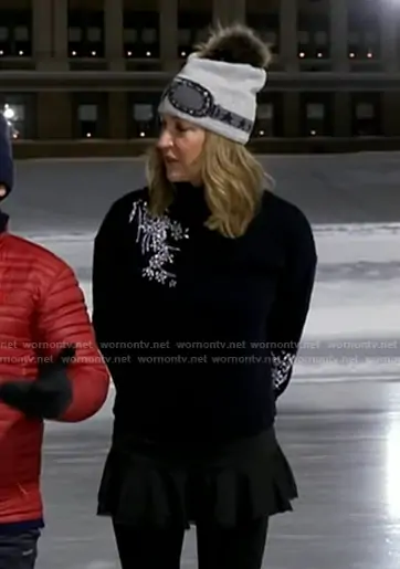 Lara Spencer on Good Morning America on ABC was spotted wearing this black embellsihed sweater and goggle print beanie on Good Morning America on Feb 12 2026's episode. Lara's Sweater is the Alani Wool-Blend Embellished Turtleneck Sweater by Cinq a Sept . Lara's Hat is the Goggles Hat with Real Fur Pom by Peter Glenn.