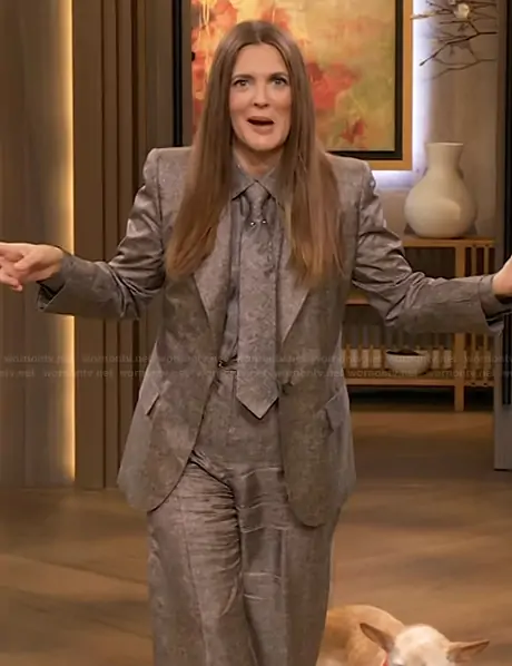 Drew Barrymore on The Drew Barrymore Show on CBS was spotted wearing this metallic blazer and blouse on The Drew Barrymore Show on Feb 13 2026's episode. Drew's Top is the Lino Print Silk Twill Shirt by Barbara Bui . Drew's Blazer is the Lino print silk twill suit jacket by Barbara Bui . Drew's Pants is the Lino print silk twill wide leg trousers by Barbara Bui . Drew's Tie is the Lino print silk twill tie by Barbara Bui.