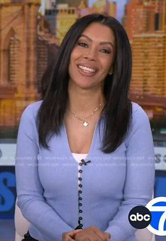 Shirleen Allicot on Good Morning America on ABC was spotted wearing this blue cardigan on Good Morning America on Feb 12 2026's episode. Shirleen's Sweater is the Polo Knit Cardigan in Light Blue by Zara.