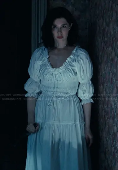 Betsy (played by Erica Dasher) on The Burbs on Peacock was spotted wearing this white ruffle trim dress on The Burbs on episode 'Sardine?' (1x03) in Feb 2026. 's Dress is the Bardot Dress by Doen.