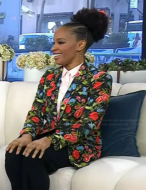 on Today on NBC was spotted wearing this floral print blazer on Today on Feb 13 2026's episode. 's Blazer is the Floral Print Blazer by Alice + Olivia.