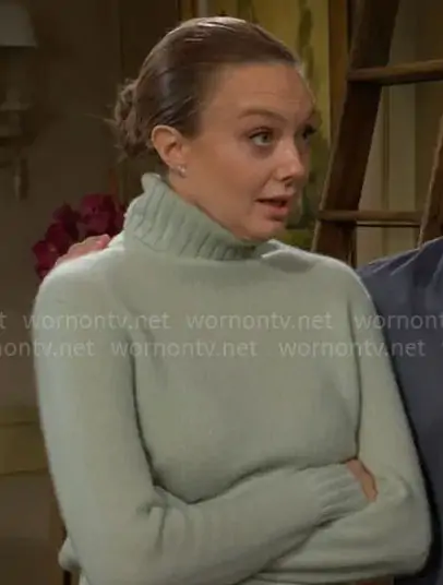 Abby Newman (played by Melissa Ordway) on The Young and the Restless on CBS was spotted wearing this mint green turtleneck sweater on The Young and the Restless on Feb 14 2026's episode. Abby's Sweater is the Cashmere Featherweight Turtleneck Sweater in Mint Green by White & Warren.