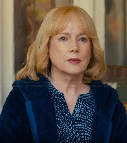 Lynn Gardner (played by Julia Duffy) on The Burbs on Peacock was spotted wearing this blue printed blouse on The Burbs on episode 'Neighbor Take Warning' (1x06) in Feb 2026. Lynn's Top is the Pintuck Blouse in Stormy Night by NYDJ.