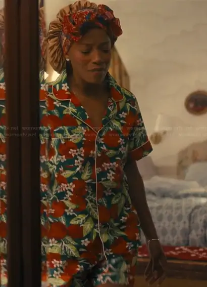 Samira Fisher (played by Keke Palmer) on The Burbs on Peacock was spotted wearing this apple print pajamas on The Burbs on episode 'Neighbor Take Warning' (1x06) in Feb 2026. Samira's Pajamas is the Orange Grove Short Sleep Set by Print Fresh.