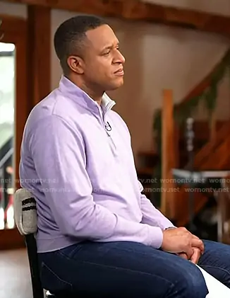 Craig Melvin on Today on NBC was spotted wearing this lilac quater-zip sweater on Today on Feb 12 2026's episode. Craig's Sweater is the Crown Comfort Quarter Zip Pullover by Peter Millar.