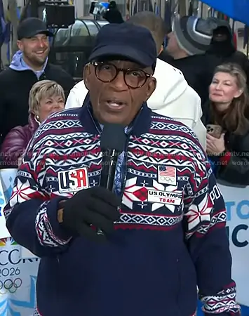 on Today on NBC was spotted wearing this navy print half-zip sweater on Today on Feb 18 2026's episode. 's Sweater is the Team USA Wool Quarter Zip Sweater by Polo Ralph Lauren . 's Hat is the Team USA Closing Ceremony Beanie by Polo Ralph Lauren.