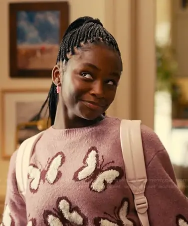 Rory (played by Kyrie McAlpin) on The Burbs on Peacock was spotted wearing this pink butterfly sweater on The Burbs on episode 'Only One Way Out' (1x08) in Feb 2026. 's Sweater is the It Girl Crewneck Sweater by Hooked Up by IOT . 's Pants is the Relaxed wide jean in white by Cotton On.