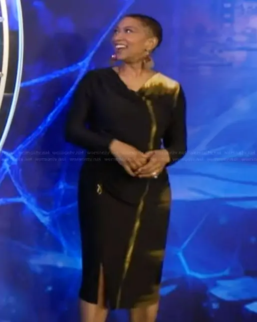 Deja Vu on Live with Kelly and Mark on Disney ABC Home Entertainment was spotted wearing this black tie dye print dress on Live with Kelly and Mark on Feb 17 2026's episode. Deja Vu's Dress is the Printed Cowlneck Side-Ruched Dress by Donna Karan.