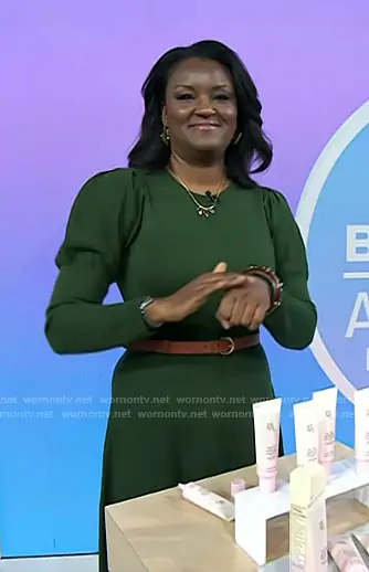 on Today on NBC was spotted wearing this green puff sleeve midi dress on Today on Feb 17 2026's episode. 's Dress is the Brielle Sweater Dress in Olive by Pomander Place.