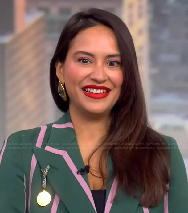 on The View on ABC was spotted wearing this green and pink stripe blazer on The View on Feb 17 2026's episode. 's Blazer is the Striped Blazer by Rowing Blazers.