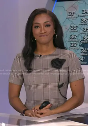 Brittany Bell on Good Morning America on ABC was spotted wearing this grey plaid floral applique dress on Good Morning America on Feb 17 2026's episode. Brittany's Dress is the Lisa Plaid Mini Dress by Ted Baker.