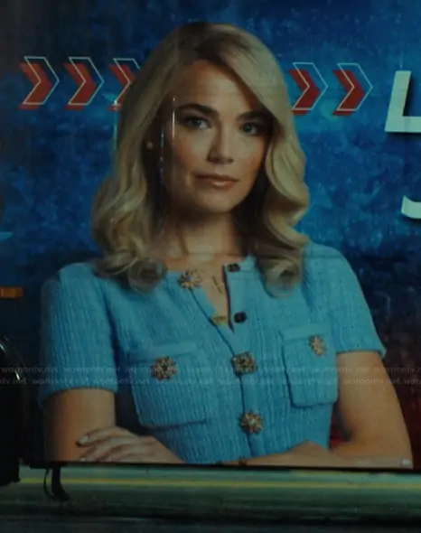 Lexy Jones (played by Rebecca Rittenhouse) on His & Hers on Netflix was spotted wearing this blue tweed button dress on His & Hers on episode 'Episode 1' (1x01) in Jan 2026. Lexy's Dress is the Beaded Button Knit Dress by Self Portrait.