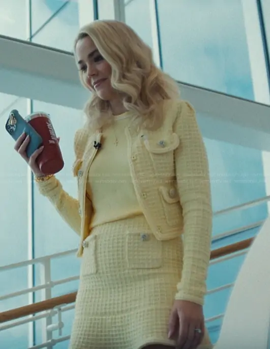 Lexy Jones (played by Rebecca Rittenhouse) on His & Hers on Netflix was spotted wearing this yellow tweed cardigan and skirt on His & Hers on episode 'Episode 1' (1x01) in Jan 2026. Lexy's Sweater is the Yellow Crop Cardigan With Jewel Buttons in Tweed by Self Portrait . Lexy's Skirt is the Textured Knit Skirt by Self Portrait.
