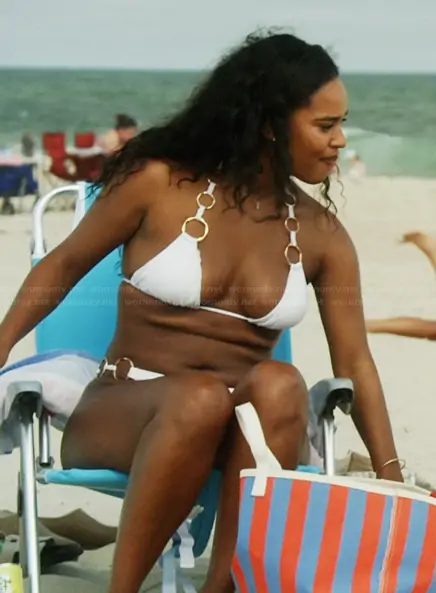 Mia Calabrese on Summer House on Bravo was spotted wearing this white ring detail bikini set on Summer House on episode 'Apology Dunes' (10x03) in Feb 2026. Mia's Bikini Top is the Zoey Bikini Top by Cult Gaia . Mia's Bikini Bottom is the Claudia Bikini Bottom by Cult Gaia . Mia's Sunglasses is the Triomphe 52mm Oval Sunglasses by Celine.