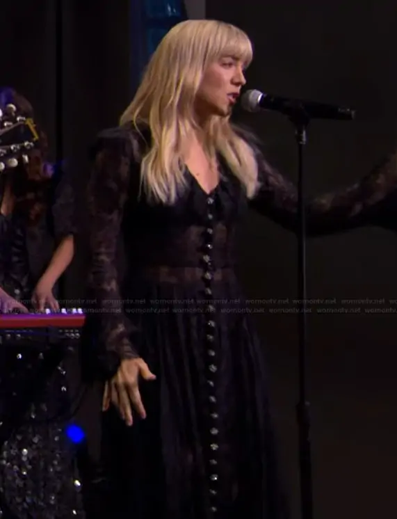 on Live with Kelly and Mark on Disney ABC Home Entertainment was spotted wearing this black lace maxi dress on Live with Kelly and Mark on Feb 18 2026's episode. 's Dress is the Black Lace Ruffle Maxi Dress by Self Portrait.