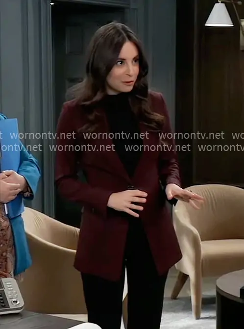 Molly Lansing-Davis (played by Kristen Vaganos) on General Hospital on ABC was spotted wearing this burgundy blazer on General Hospital on Feb 18 2026's episode. Molly's Jacket is the Etiennette Blazer by Theory .