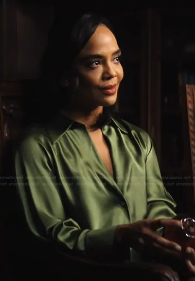 Anna Andrews (played by Tessa Thompson) on His & Hers on Netflix was spotted wearing this green silk blouse on His & Hers on episode 'Episode 2' (1x02) in Jan 2026. Anna's Top is the Bias Long Sleeve Blouse by Vince.