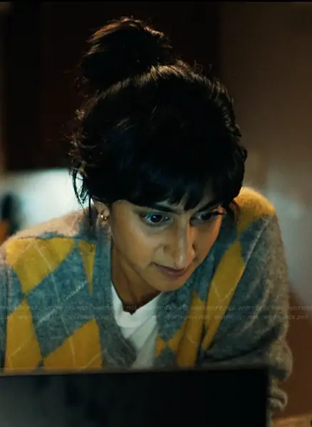 Priya (played by Sunita Mani) on His & Hers on Netflix was spotted wearing this argyle knit cardigan on His & Hers on episode 'Episode 3' (1x03) in Jan 2026. Priya's Sweater is the Argyle Cardigan by Uniqlo.