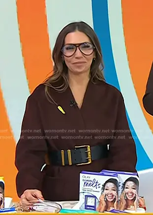 Melissa Garcia on Today on NBC was spotted wearing this brown wrap jacket and pants on Today on Feb 19 2026's episode. Melissa's Coat is the Handmade Wool-Blend Coat in Dark rust brown by H&M . Melissa's Pants is the Wide-Leg Dress Pants in Dark brown by H&M . Melissa's Belt is the Belt with Double Buckle and Loop by Zara . Melissa's Eyeglasses is the Liam Readers by Look Optic.