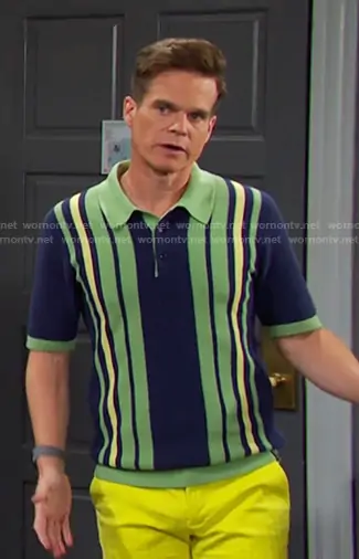 Leo Stark (played by Greg Rikaart) on Days of our Lives on Peacock was spotted wearing this navy and green striped polo shirt on Days of our Lives on Feb 19 2026's episode. Leo's Shirt is the Structured Polo Sweater in Atlantic Blue by Scotch & Soda.