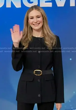 on Good Morning America on ABC was spotted wearing this black jacket and suede belt on Good Morning America on Feb 19 2026's episode. 's Jacket is the The Spencer Jacket by Favorite Daughter . 's Belt is the The Suede Jean Belt by Favorite Daughter.