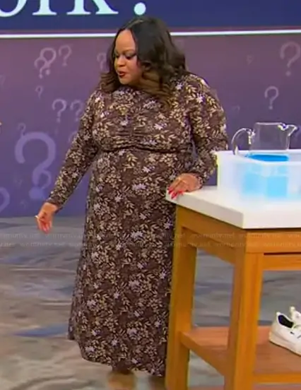 on Tamron Hall Show on ABC was spotted wearing this brown floral mesh dress on Tamron Hall Show on Feb 19 2026's episode. 's Dress is the Garden Ruched Bodice Midi Dress by Loft.