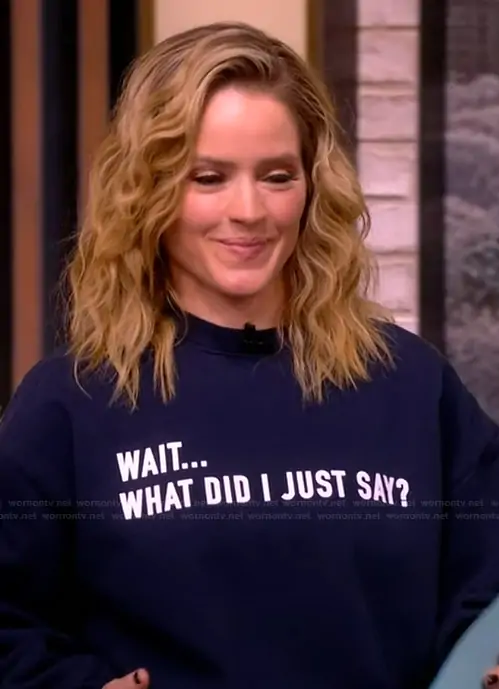 Sara Haines on The View on ABC was spotted wearing this blue sweatshirt and embellished jeans on The View on Feb 19 2026's episode. Sara's Sweater is the Wait, What Did I Just Say? Unisex Crew Fleece Sweatshirt by IWBC . Sara's Pants is the Jude Embellished Mid-Rise Jeans by Simkhai.
