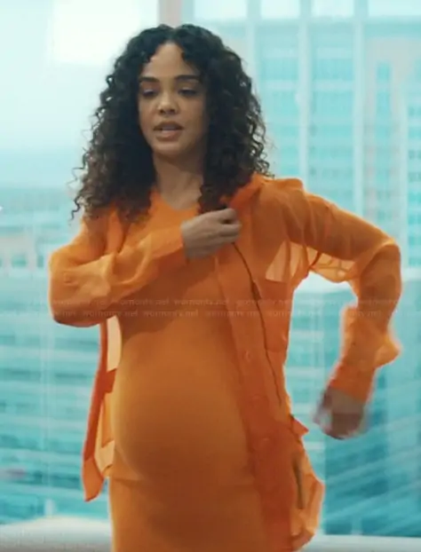 Anna Andrews (played by Tessa Thompson) on His & Hers on Netflix was spotted wearing this orange sheer jacket on His & Hers on episode 'Episode 6' (1x06) in Jan 2026. Anna's Jacket is the Colson Silk Safari Jacket by L'Agence.