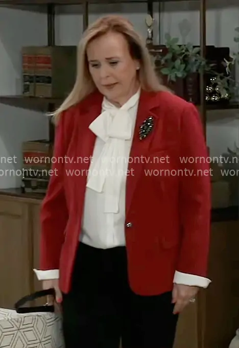 Laura Collins (played by Genie Francis) on General Hospital on ABC was spotted wearing this white tie-neck blouse on General Hospital on Feb 20 2026's episode. Laura's Top is the Leni Blouse by Kobi Halperin .