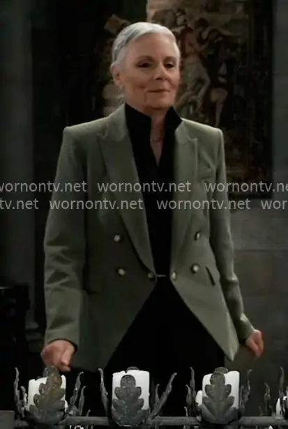 Tracy Quartermaine (played by Jane Elliot) on General Hospital on ABC was spotted wearing this green blazer on General Hospital on Feb 20 2026's episode. Tracy's Jacket is the Miller Dickey Jacket in Stone Army by Veronica Beard .